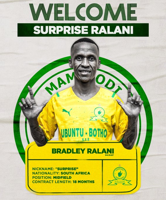Mamelodi Sundowns released a statement saying that they were “happy” to welcome attacker Bradley “Surprise” Ralani from Cape Town City. “Mamelodi Sundowns are delighted to welcome Bradley “Surprise” Ralani from Cape Town City.”