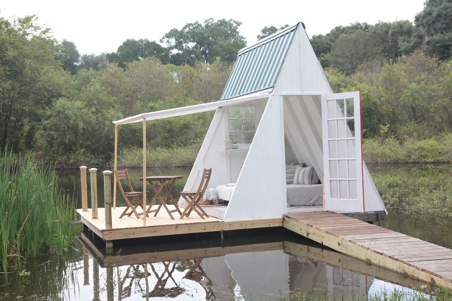 Fans of glamping will love this Vrbo cabin in Fort White, which has a lovely covered porch from which to admire the magnificent views of the moss-covered cypress and oak trees.