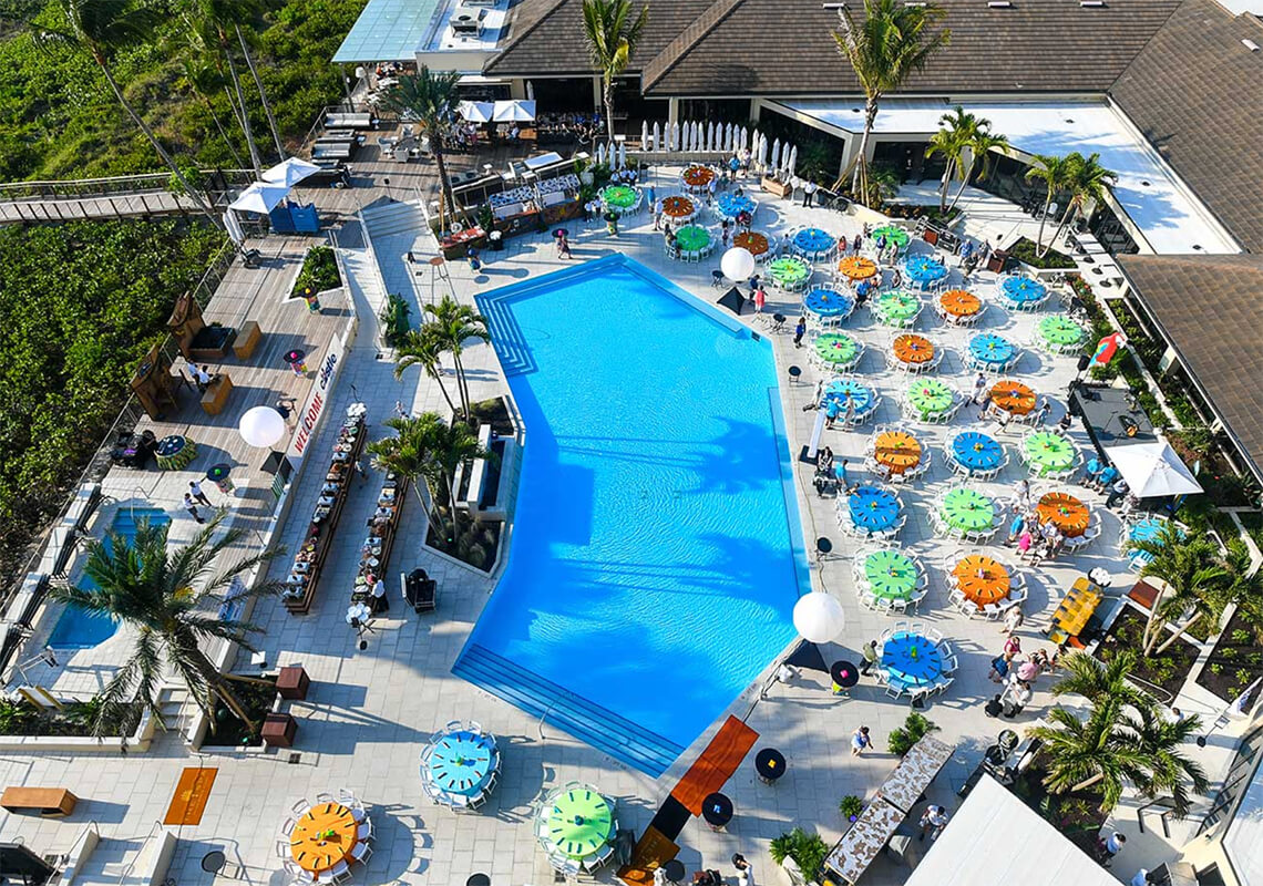 - Four beachside covered decks and pools