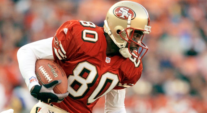Achievements: Inducted into the Pro Football Hall of Fame (2010); 3-time Super Bowl champ; Super Bowl MVP; NFL MVP; 13 Pro Bowls; Leads the NFL in all-purpose touchdowns (208); Leads the NFL in receiving yards (22,895); Only player in NFL history with more than 20,000 receiving yards; Leads the NFL in total receptions (1,549); Leads the NFL in all-purpose yards (23,546); Leads the NFL in TD receptions (197); leads the NFL in consecutive games with at least one reception (274); holds 36 total NFL records