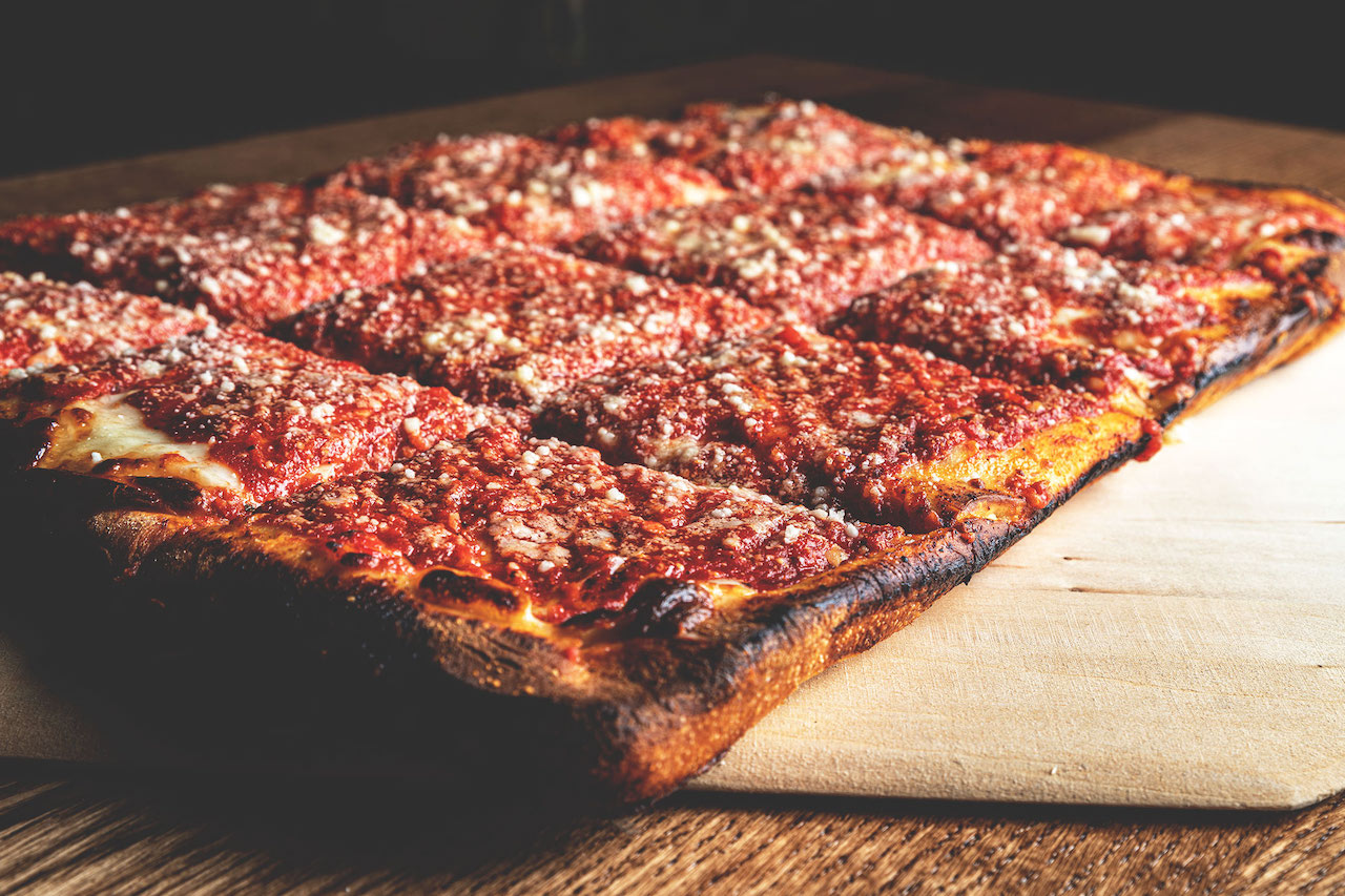 The 1940s-inspired Cloverleaf Pizza in Macomb, Michigan serves up Detroit-style pizza. The sauce and cheese alternate positions in pies, which are more shaped like enormous rectangles.