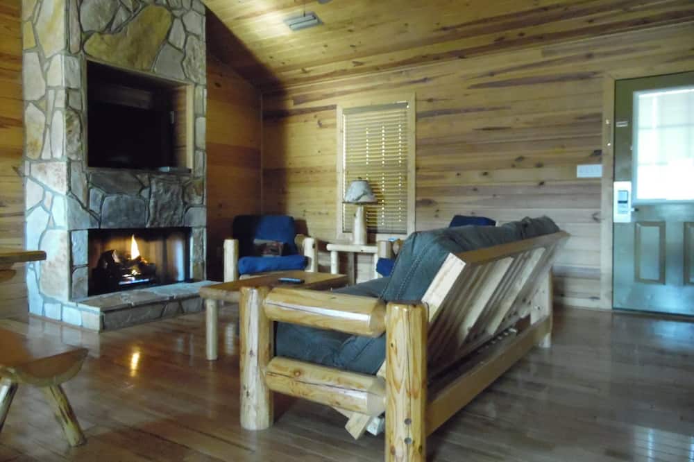 This charming Alabama cabin is 1,000 square feet and includes two bedrooms, two beds, and one complete bathroom, making it ideal for a family or small group of four.