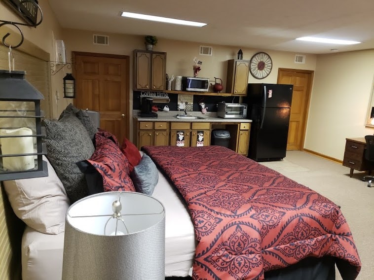 Consider this Airbnb rental cottage with a loft bedroom, desk, kitchenette, bathroom, living room, and dining area if you want to be on more than 150 acres of stunning nature. It includes front and back patios with furniture so you can unwind and take in the view.