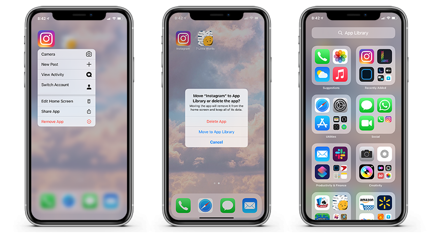- Finally, tap Remove from Home Screen. This will remove your app from the home screen, but you will still be able to find it in the App Library, which you can access by swiping left on your home screen. Then you can find any hidden apps using the search bar at the top of the App Library screen.
