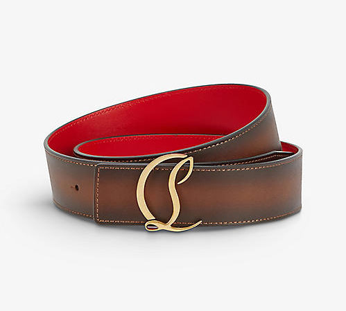 This belt is available in three different leather colors: black, brown, and burgundy. It is styled to look like the letters “LV” that are stamped on the bottom of a Louis Vuitton bag.