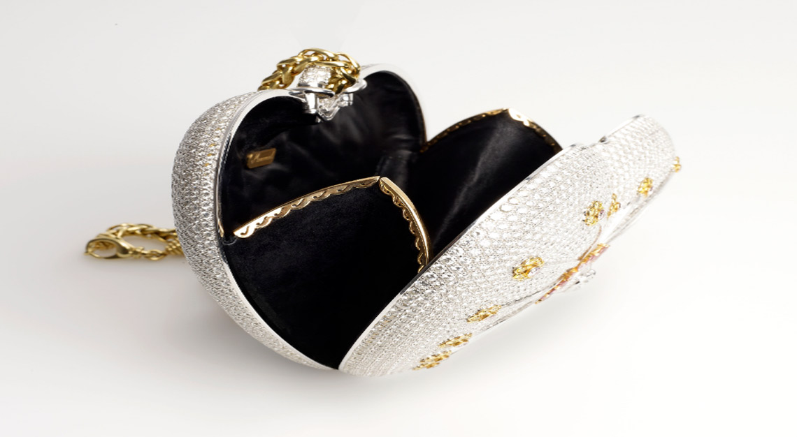 This includes the Mouawad 1001 Nights Diamond Handbag, which is a handcrafted purse made of 18-karat gold in the shape of a heart and was created by artisans after 8,800 hours of laborious effort.