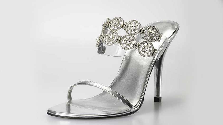 The circles at the top of the foot of the two-band shoe are adorned with diamonds, and the band that crosses the toes is made of platinum. These are without a doubt the most eye-catching shoes a woman could possibly wear.