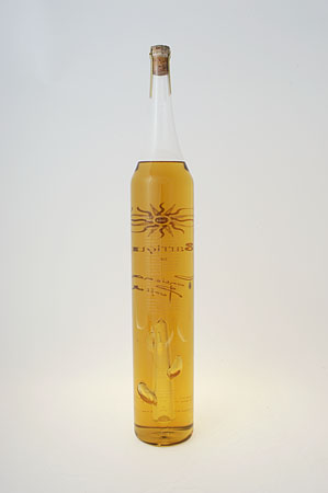The bottle of this “King Sun Aged Tequila” is designed to resemble the shape of the sun. The distillery that makes Tequila Rey Sol promotes its label by saying that it is “two pieces of art in one.”
