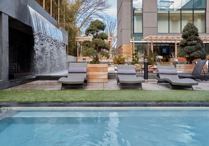 In this location, you will find a total of 15 treatment rooms, luxury couple’s suites, four facial rooms, wet rooms with Vichy showers, Roman baths, saunas, steam rooms, a fitness center, and a seasonal outdoor pool with a bar and an observation deck.