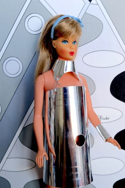 She appeared either as a brunette or a blonde, wearing a dress that resembled a tin can and a pink bikini, both of which were influenced by the avant-garde designs of Paco Rabanne. She was transported in a box made of cardboard that bore the inscription “Barbie Loves the Improvers” on one of its sides.