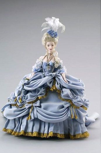 This doll has a top-heavy haircut complete with a feathered cap to accurately portray Antoinette’s extravagant hairstyles and clothes. The ballgown is light blue with gold accents, and the doll has a top-heavy hairstyle.