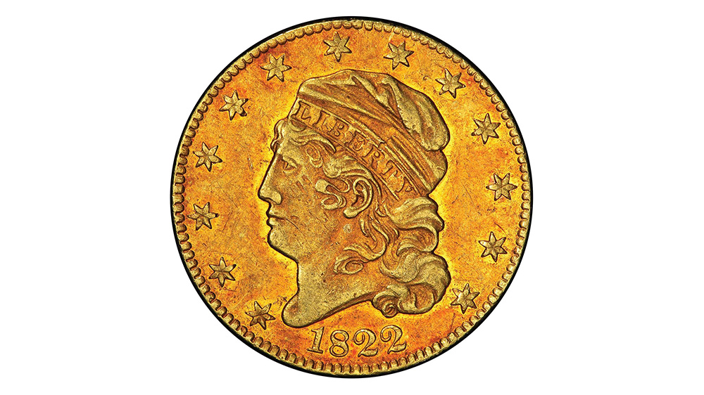 The 1822 Half Eagle is also known as the 1822 Capped Bust Gold $5 Half Eagle.