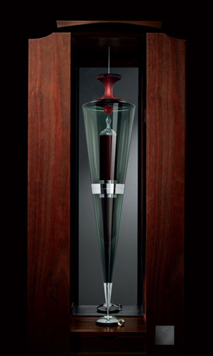 The ampoule is held in place by a glass sculpture in the shape of a spear, which is then placed inside a box made of bespoke wood.