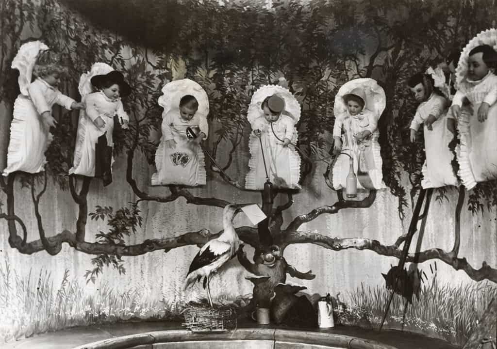 It shows a sculpture of a stork ready to deliver babies to baby dolls that are perched on tree branches.