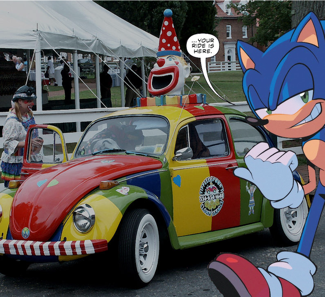 This lonely clown/Sonic the Hedgehog seen through a car window belongs in a list of photographs that do not have context because not much is known about either of them.
