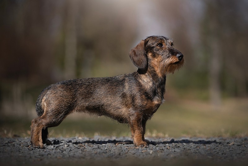 The Wild Boar Dachshund gets its name from the coarse hair that is a combination of grey, black, and brown that it has.