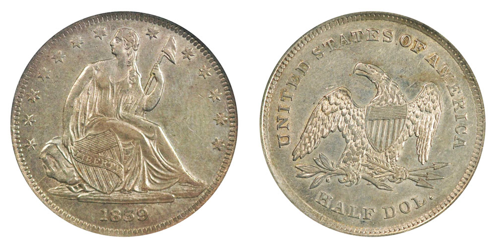 In contrast to the standard 1839 Seated Liberty Half Dollars, which feature an additional piece of drapery draped over Lady Liberty’s left arm, these original proofs of the coin do not include that element of the design.