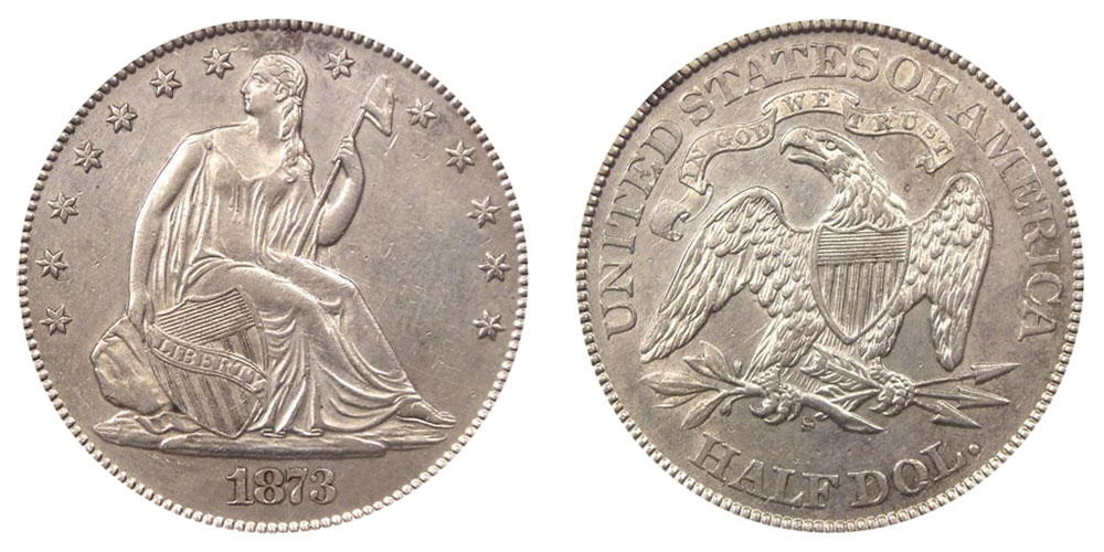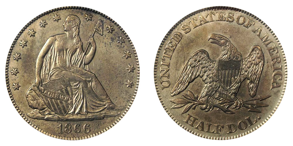The 1866 Seated Liberty Proof with No Motto or Arrows is a half-dollar that is both exceptionally rare and one of a kind.