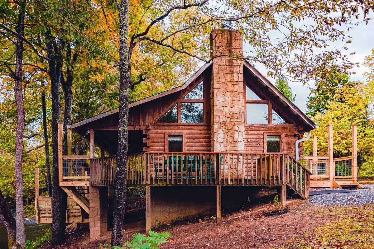 This cabin has 180-degree views from three decks as well as the inside. It is perched high up on a rock overlooking the French Broad River.