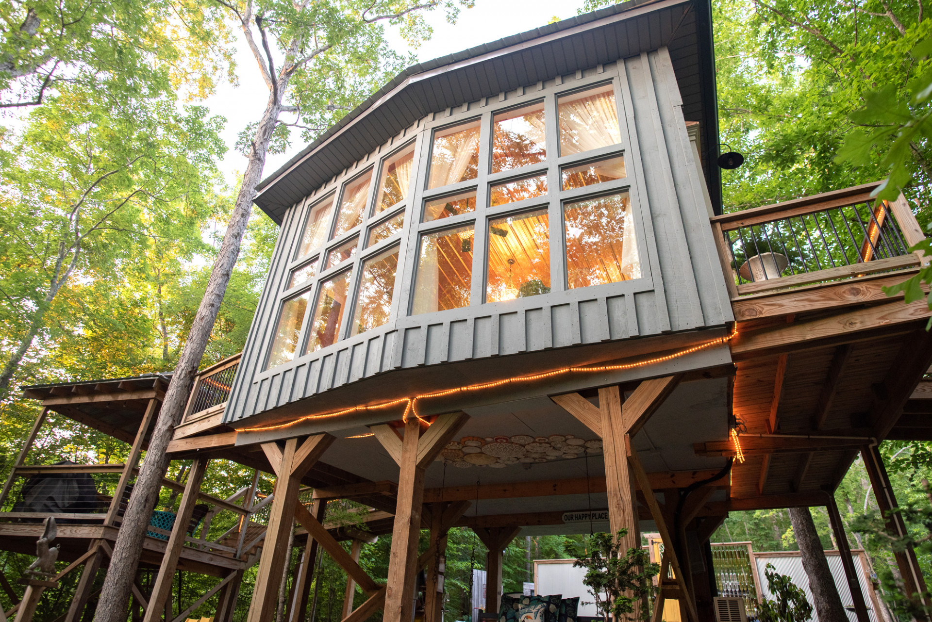 With a lit walkway leading up to it and being tucked away among 18 acres of private woods, this lovely treehouse appears to be a scene from a fairytale.