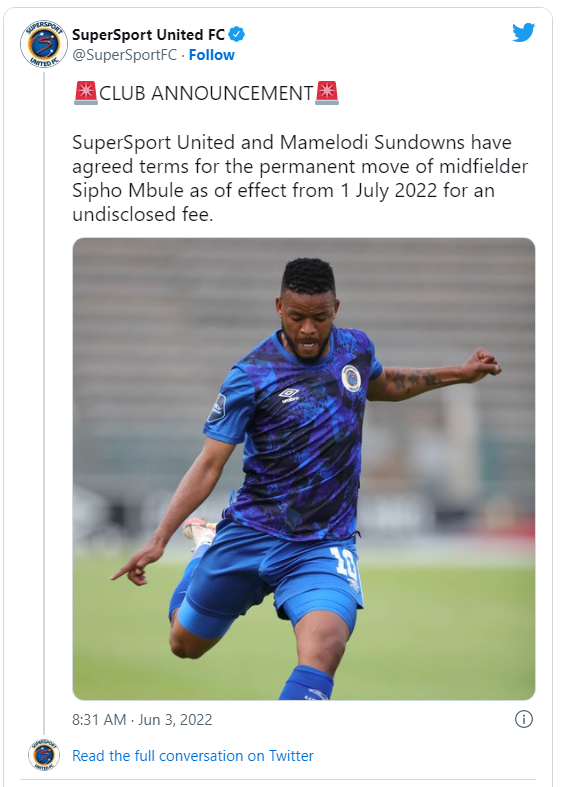 It was revealed on Friday by SuperSport United that Mamelodi Sundowns had made their first signing, with midfielder Sipho Mbule moving his allegiance from Tshwane to Mamelodi Sundowns.