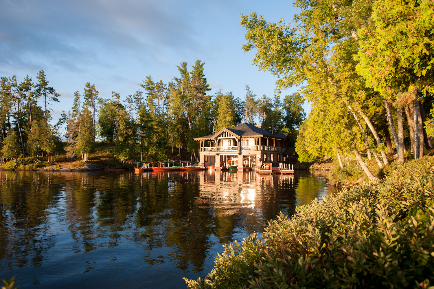 It features both private cabins and rooms in the main lodge, all of which are decorated in a style that is characteristic of lakeside living, with elements such as stone fireplaces, an abundance of plaid, and large covered terraces that are furnished with Adirondack chairs.