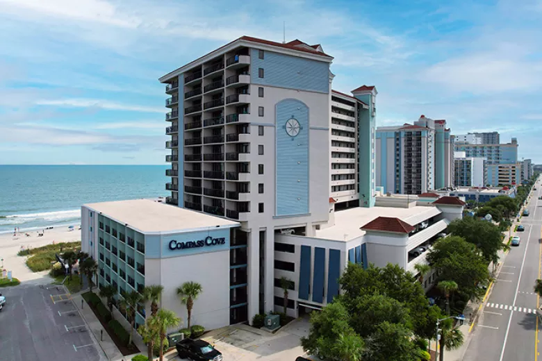 Condos at the Compass Cove Oceanfront Resort range in size from one to three bedrooms, and all have ocean views, flat-screen TVs, and complimentary DVD rentals.