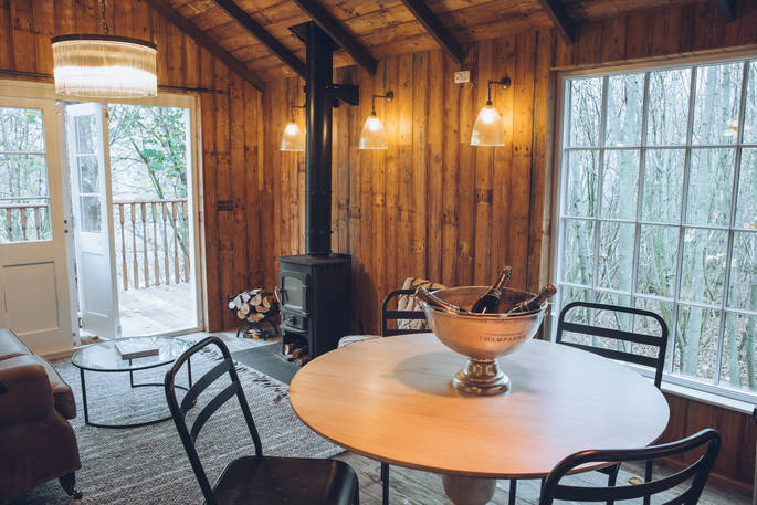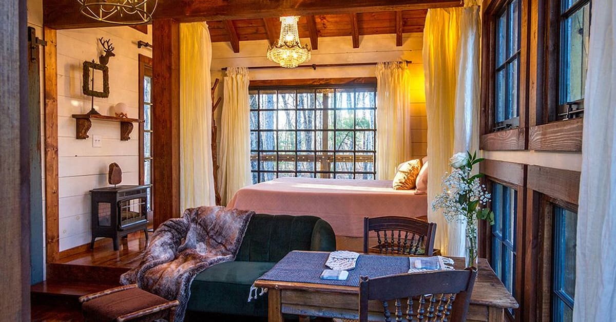 Even though it is tucked away in the trees and surrounded by nature, nothing is given up here. With an antique crystal chandelier hanging over the king-size bed and Rainbow Poplar live edge headboard, it also features a custom-built king-size bed with matching white flowing curtains enclosing the sleeping area.