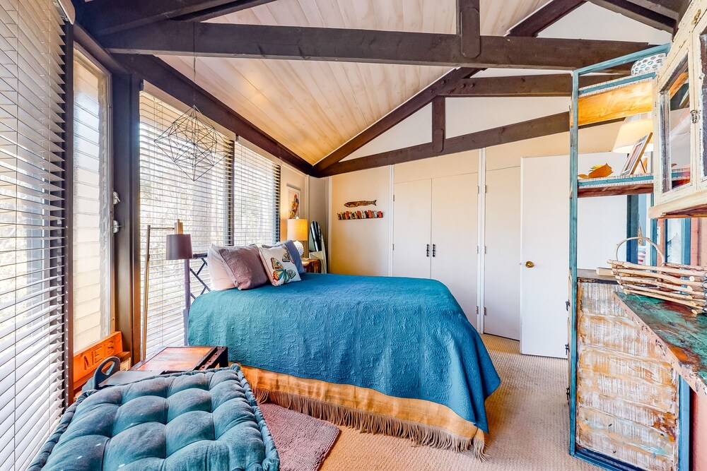 The Moravian Star that is directly above is what gave it the moniker “Stella Vista.” Vintage French doors that lead to a deck and a peaceful view of the treetops will greet you as you awaken.